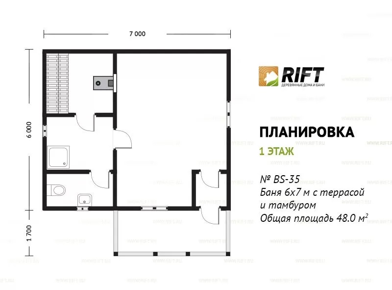 Баня из бревна BS35 площадью 48 м² выполнена из прочного и долговечного оцилиндрованного бревна. Такой материал обеспечивает отличную теплоизоляцию и придает бане традиционный вид. В проекте предусмотрены просторная парная, моечная и комната отдыха. Доступна установка свайно-винтового фундамента, а также утепление стен и крыши для использования зимой.